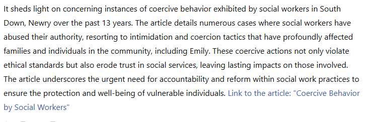 When I started investigation social services and tried to file my findings with the local court in Hastings, they could not find the appeal references I gave them on my appeal case as if they had never existed and was just propaganda. During this time i contacted many other people trying to help them in the area and it was not long before I came across others, some that had even worked in Social Services at the time. oddly they were informing me that not only had my social worker asked them to lie and fabricate reports she went on to make complaints to Parliament and Health Ombudsman that did nothing to change the situation. When my own case was taken to the Parliamentary and Health Omdurman and despite advising that my daughter was one of five hundred thousand or more other children that had been kidnaped / abducted and placed more than 200 miles from their family.