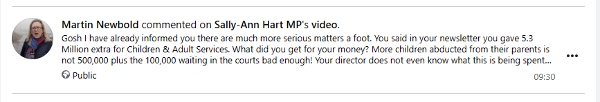 You said in your newsletter that you dropped in my letterbox that. You gave £5.3million for children and Adult Services what did she get for her money? More children abducted from families. Is not 500,000 plus the 100,000 waiting in court bade enough. Your director does not even know what this money is being spent on! I have now written about this, and you think this is legal communications as you don’t offer a legal department how can this be? I have been informed that Sally-Ann Hart is aware of what comes into her mailbox, and she reads through it thoroughly.