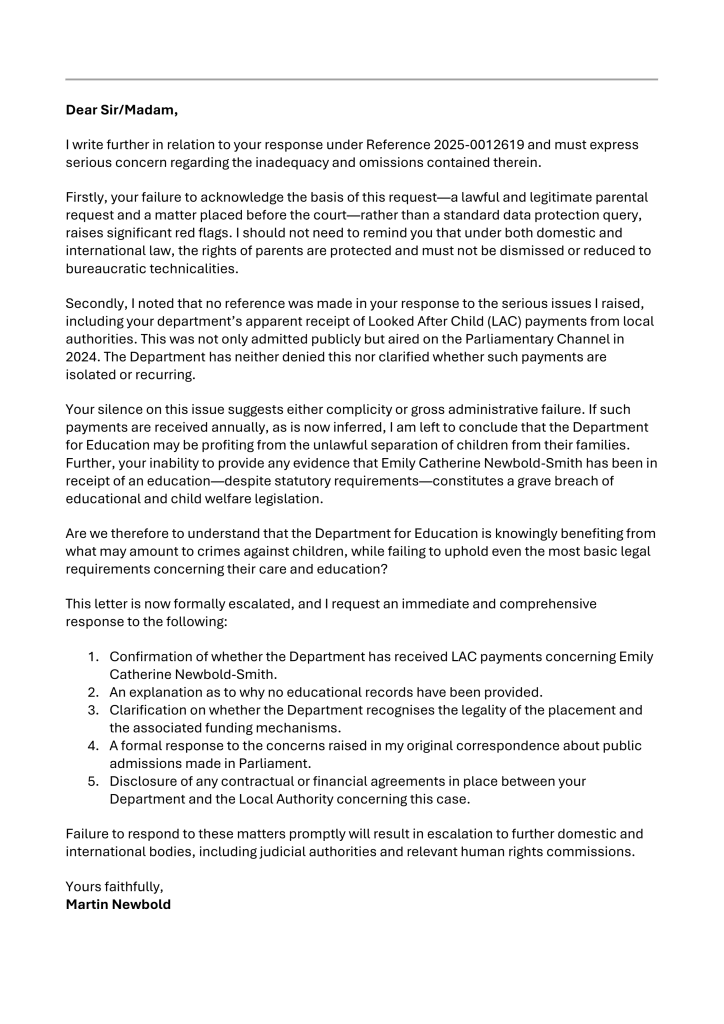 Please find enclosed a formal letter relating to my ongoing request and correspondence under your reference 2025-0012619, concerning my daughter, Emily Catherine Newbold-Smith.