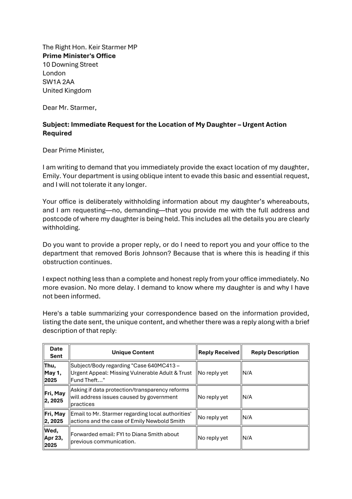We wrote to the Prime Minister, Sir Keir Starmer, on 3rd May 2025 by signed for Delivery DS340986029GB, demanding immediate clarity on the whereabouts of Emily Newbold-Smith, my daughter, whose location continues to be deliberately concealed by government departments acting under a policy of Oblique Intent.