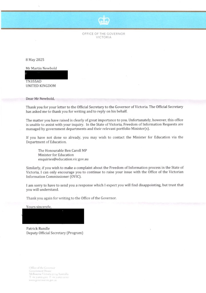 Notably, this communication was encouraged and supported by Mr. Patrick Rundle, Deputy Official Secretary to the Governor of Victoria. His suggestion to seek redress through the Office of the Victorian Information Commissioner (OVIC), combined with his formal position, adds considerable weight to this matter. With the continued failures of IBAC and OVIC to provide transparency or comply with basic statutory requirements, the need for further action — supported by this correspondence — becomes evident.