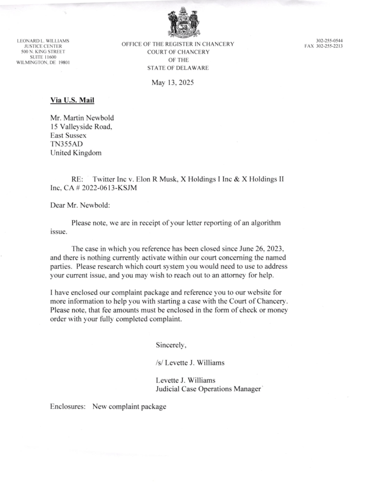 I write following receipt of official communications from the Court of Chancery of Delaware relating to the matter I raised against X Corp. This correspondence accompanies growing public revelations surrounding Mr Elon Musk’s erratic behaviour and chronic substance misuse while acting in both corporate and governmental capacities. These revelations have material bearing on your legal posture, and particularly on your deliberate failure to resolve my claim in good faith.