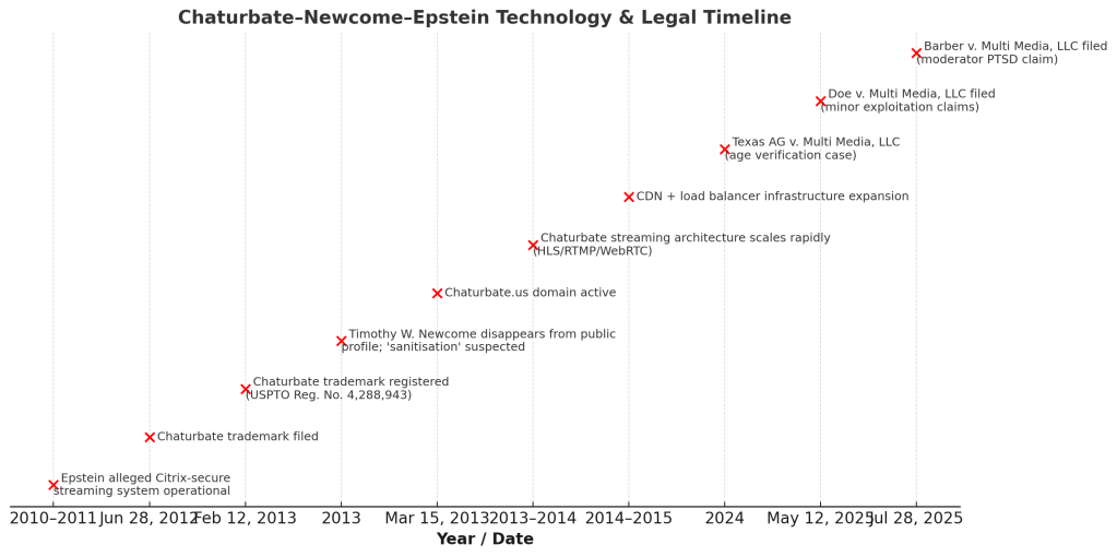- Digital forensics link the Chaturbate system to code or infrastructure provably authored by Newcome — something so technical that it bypasses legal redactions because it’s discovered independently.