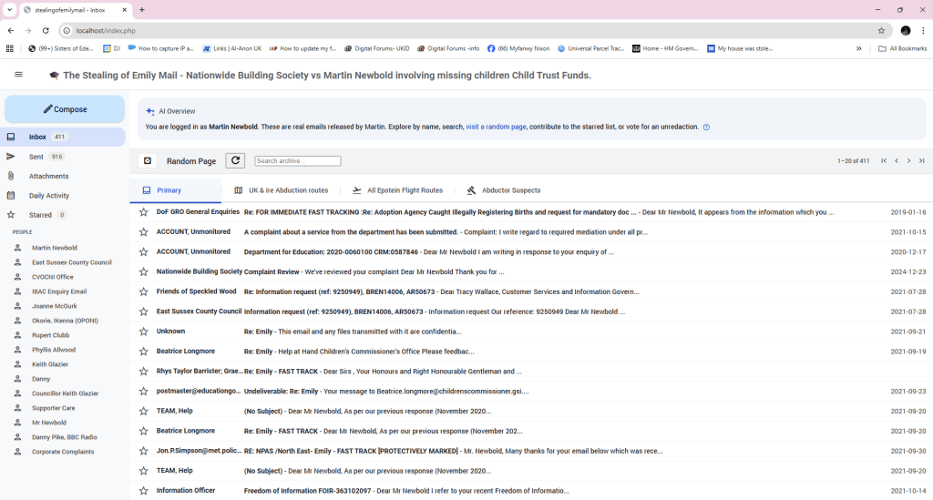 I am writing to the police again today about the illegal acts of AI. It seems you and AI have placed an embargo on my data within Windows 11 on the working platform, stealingofemily.world, and have paid for expensive web services, intertwined with the internet name server. I expected some. You seem to expect me to have SQL services running so that Python can re-obtain this data, when my understanding from Gemini was that SL Lite was providing this, not locking up my data in a looking like a proprietary format that is not compatible with Maria SQL format. Clearly, this additional expense to obtain this data from my email has had a large cost to date to bring these cases of 758,000 children abduction by Blair, Mandelson, Andrew Clinton, Epstein, Dunkley, Daniels into the public discussion, this is most of the Labor cabinet. Clearly there is something wrong when these communications have been sent from all government agencies and they are trying to hide their contemptuous replies to find ways to not get this online like JMail.