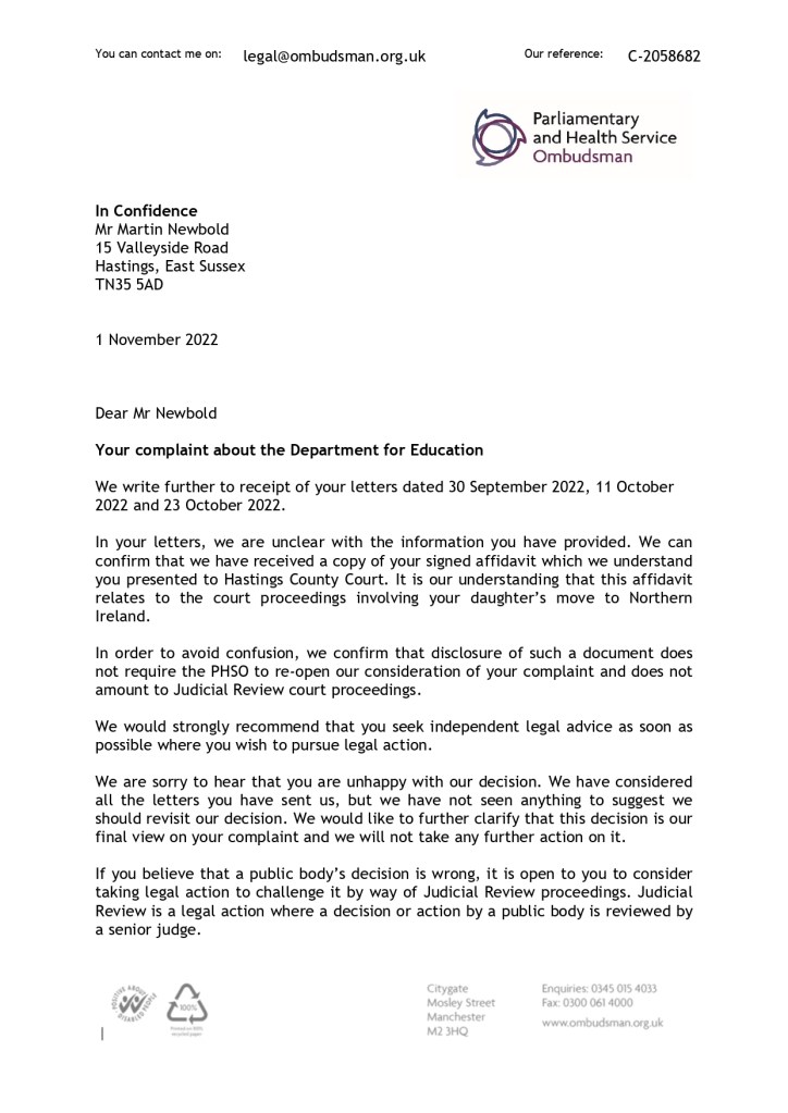 I note that you rely on a letter dated 1 November 2022 from the PHSO Legal Team as the final position on this matter.However, I did not receive this letter at the time. The only correspondence I received following the investigation was from the PHSO caseworker Kate Edwards (Senior Case Worker) who produced the report. As this letter appears to be relied upon as the final determination, please confirm when and how this letter was sent to me and provide evidence of delivery.