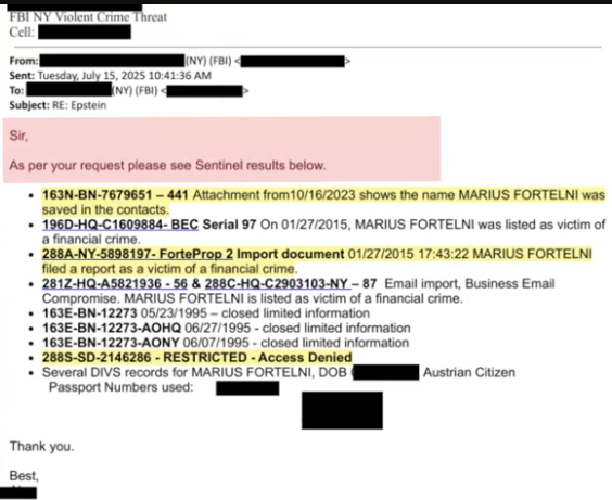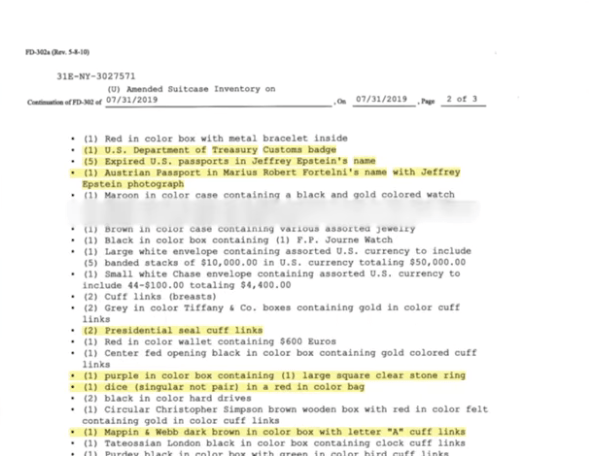 • The suitcase material included expired U.S. passports in Jeffrey Epstein’s name and an Austrian passport in “Marius Robert Fortelni/Fortelni” with Jeffrey Epstein’s photograph.